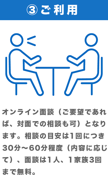 相談目安は1回につき30分〜60分程度(内容に応じて)、面談は1人、1家族 3 回 まで無料です。